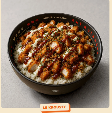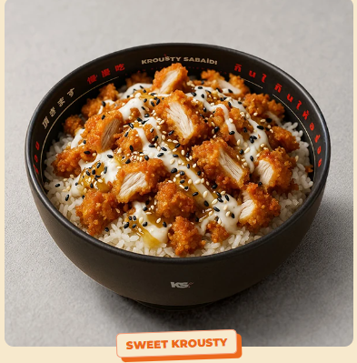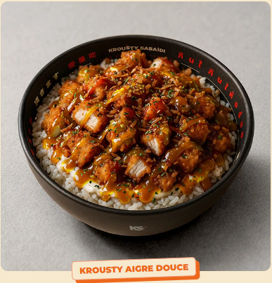 Ingrédients : Riz parfumé, poulet kroustillant, sauce sweet K, sauce lemon et graine de sésam